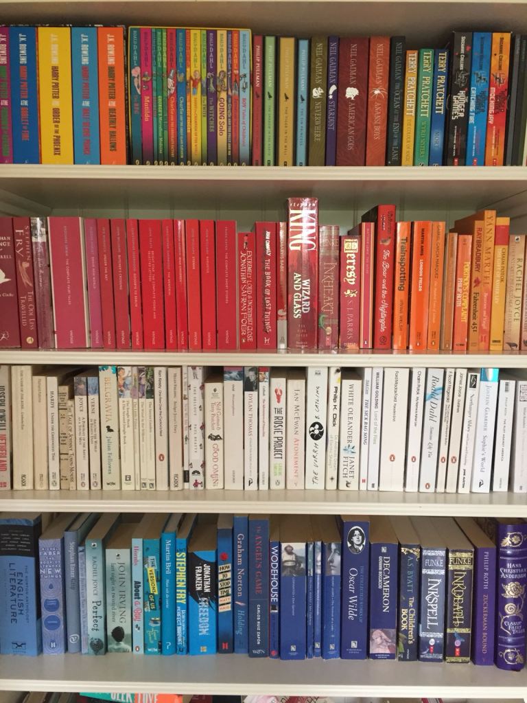 – Kleur. Ik heb altijd tegen mezelf gezworen dat ik nooit, echt nooit, mijn boeken zou indelen op basis van kleur. Het ziet er prachtig uit (en ik moet toegeven dat ik het eigenlijk best leuk vond toen mijn boeken zo sorteerde om een mooie foto te maken), maar ik vind dat je boeken dan eerder lijken op decoratie dan functionele dingen. En ook moet je dan heel goed onthouden welke kleur een boek heeft, anders vind je hem nooit weer terug.